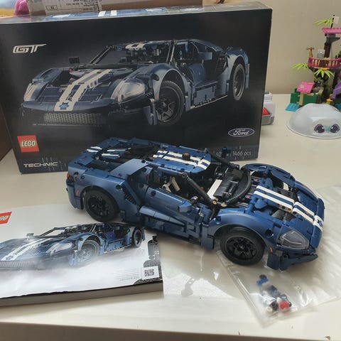 Sælger denne imponerende LEGO Technic model af 2022 Ford GT (set 42154). Modellen er fuldt bygget og i perfekt stand – ingen manglende dele. Den er i skala 1:12 og har detaljer som en V6-motor med bevægelige stempler, justerbar bagvinge og autentisk blå farve med hvide striber.