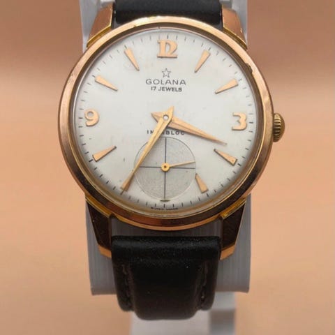 Wyler herreur. I god stand. Swiss vintage ur fra ca. 1950. Der er lidt brugsspor på kassen, men ingen ridser eller skrammer på glasset. Gylden og meget patineret urskive med sorte tal og visere. Manuelt mekanisk urværk, som går og tikker fint. Uret sidder på en sort læderrem, og det måler ca. 23mm uden krone og 40mm med horn.