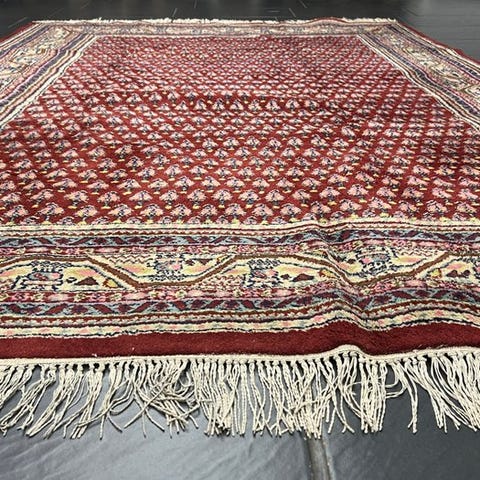 Der tilbydes et håndknyttet orientalsk tæppe fra provinsen Sarough (Her: Indo mir).
