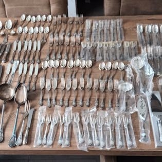 Christofle sæt bestik Marly sølvplet, model i Louis XV-stil. Alle stykker er i hvert fald ubrugt, og stammer fra perioden 1975-2000. De fleste er uåbnede, og kun få genstande viser misfarvning som følge af alder.