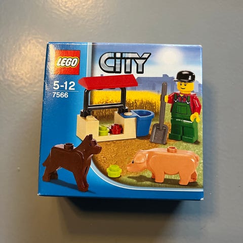 LEGO City bondegård og traktor sæt. Sættet omfatter bondegårdsbygninger med røde tage, grønne baseplader, silo/vandtårn, stige og små tilbehørsdele. Der medfølger blå traktor med frontskovl, aftagelig trailer, flere minifigurer samt dyr som køer og hund. Egnet til leg med landbrugstema og bymiljø i LEGO City serien. Der sidder et mærke på forsiden af den en manual.