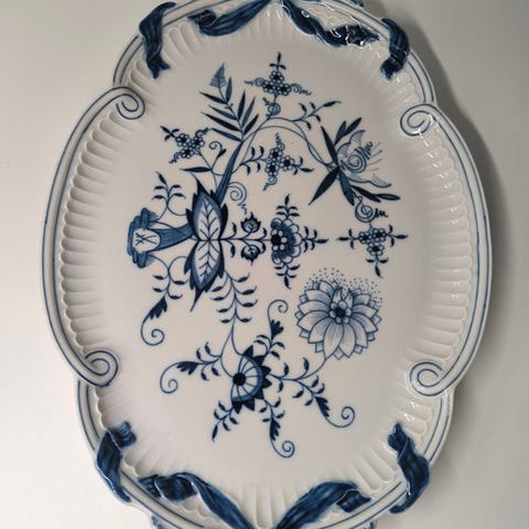 Særpræg: håndmalet under glasur, dekoret Løgmønster bliver i øjeblikket igen solgt hos Meissen (pris for konfektblad Nyt snit med dekor Løgmønster (19x17x5 cm, mindre end dette) aktuelt hos Meissen 199,00 euro)