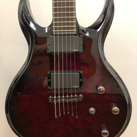 Elektrisk seksstrengs guitar - Struktur: bolt-on - Krop: mahogni - Top: quiltet ahorn - Hals: ahorn - Rille: palisander - Scale: 24,62” - 24 jumbo-bånd - Inlays: 'Clouds' perlede - Binding: cremehvid - Pickups: 2x Humbucker B.C. Rich B.D.S.M. (Broad Dynamic Sonically Matched) - Kontroller: 1x Tone + 2x Volume + 3-position vælger - Bridge: Tune-O-Matic med Stop Bar - Stemmeskruer: B.C. Rich lukkede - Hardware-finish: kromat - Farve: gennemsigtig drageblodrød - Finish: højglans.