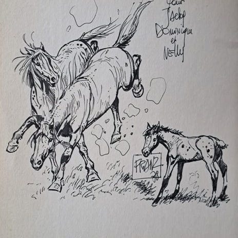 Et klassisk værk inden for den franco-belgiske historiske tegneserie, i Original Edition 1980, hædret med en superb dedikation signeret og dateret af Franz (6/04/1980): stor fuldside-tegning (kvindelig figur + hestehovede meget gennemarbejdet), venlig besked, sort blæk nervøs og elegant. En autentisk brik, følsom og meget “Franz”: hestens udtryk, nervøsitet i stregen, alt er til stede.
