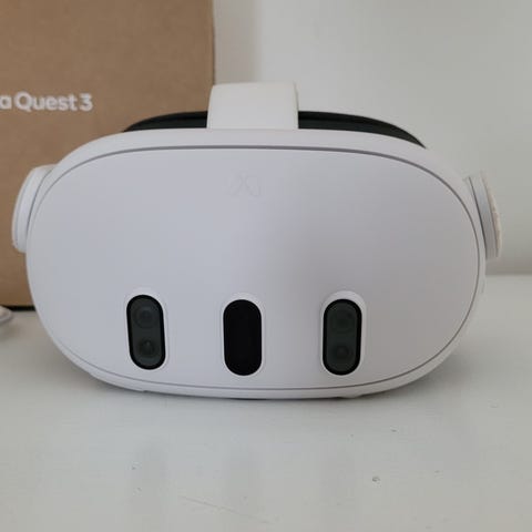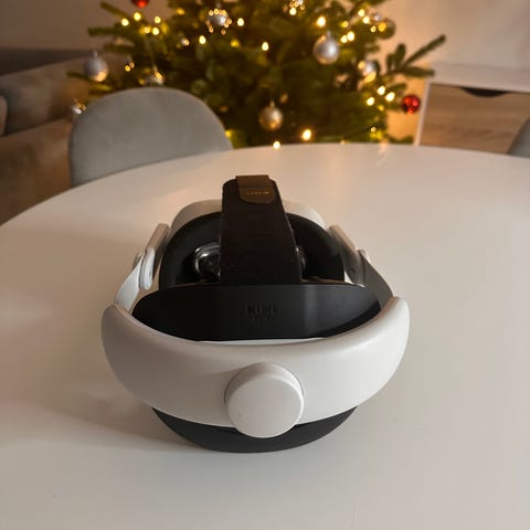 Meta Quest 2 VR-headset i hvid. Trådløst virtual reality-headset med medfølgende controllere. Velegnet til spil og VR-oplevelser, hvor brugeren kan bevæge sig frit uden kabler tilsluttet en pc. Headsettet har indbygget rem til hovedet og polstring omkring øjnene for bedre pasform.