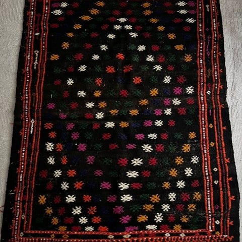Bemærk: Farven på tæppet er ikke bleg. Det er opnået ved brug af pastelfarvede nuancer. Kantene er korte. Nogle steder er det slidt af tiden. Små reparationer kan foretages.