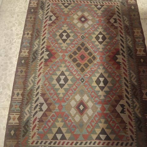 Azeri kilim tæppe fra Aserbajdsjan, model Azeri, måler 120 cm x 85 cm, uld på uld, flerfarvet, midten af det 20. århundrede, i meget god stand, professionelt renset. Klik på den blå "gå til varen" knap, for at købe eller byde på denne vare. Den samlede pris vil blive vist inden du afgiver dit bud.