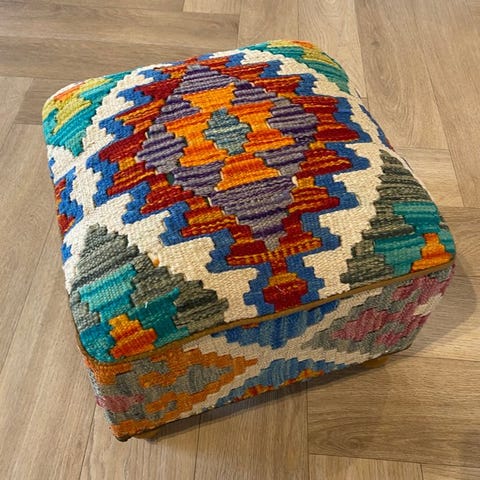 Afghansk Kelim puf, model Kelim Poef(Ongebruikt/Nieuw), uld på bomuld, oprindelse Afghanistan, i særdeles god stand og professionelt renset, ca. 34 x 34 x 29 cm. Klik på den blå "gå til varen" knap, for at købe eller byde på denne vare. Den samlede pris vil blive vist inden du afgiver dit bud.