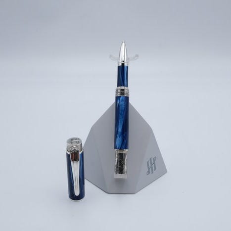 Håndlavet i **Middelhavsblå perlemor-resin**, reflekterer pennen øens omgivelser af hav og himmel, mens **sterlingsølv-overfladen** tilføjer dybde, glans og håndværksmæssige detaljer.
