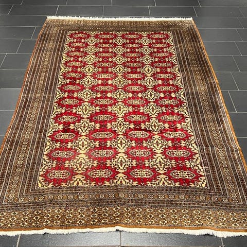 Vi præsenterer for Dem et enestående, håndknyttet Buchara-orientteppe fra Pakistan – et sandt mesterværk inden for tæppekunst.