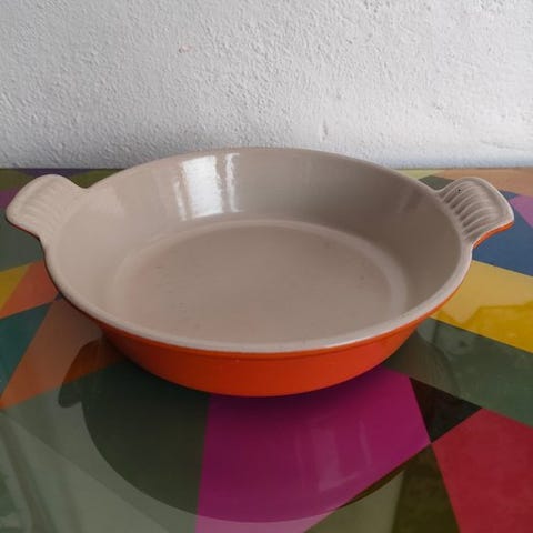Smukt ovnfad i orange-rød farve i emaljeret støbejern, signeret, nummer 32, fra det berømte franske mærke Le Creuset.