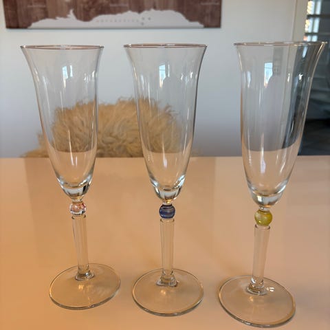 champagneglas i lilla glas. Sættet består af høje, slanke glas med klar fod og lilla stilk og bæger. Velegnet til servering af mousserende vin eller andre kolde drikke ved borddækning.