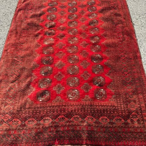 Smukt håndknyttet tæppe af uld. Ulden er naturligt farvet uden kemikalier. Hovedfarven er rød, creme, sort. Tæppet er med smuk, professionel, stram knytning og har korte frynser.