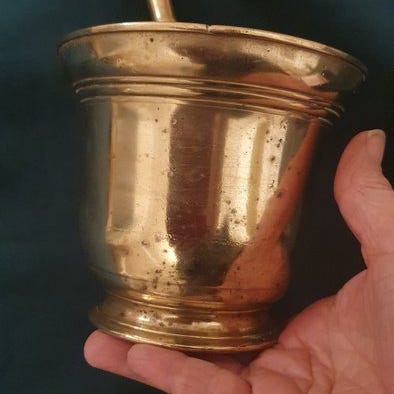 Gammel mørtel med tilhørende pestel, alt i bronze