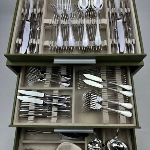 Elegant Christofle Vendôme Coquille-service med 126 dele i sølvbelægning, produceret omkring 1960–1970, ideelt til 12 personer. Klassiske linjer med raffineret skaldusur, en af ikonerne inden for fransk sølvtøj efter krigen. Perfekt for dem, der ønsker et imponerende middagsbord i mid-century stil, til samlere eller som en prestigefyldt gave. Rent og skinnende, klar til brug; kun almindelige tegn på alder, der er i overensstemmelse med alderen. Med ægte og læsbare Christofle-punzonering.