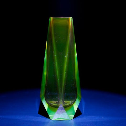 Glasset har en smuk farvedybde samt fine bobler og lette uregelmæssigheder, typiske for arbejdet med mundblæst glas og varmforarbejdning.