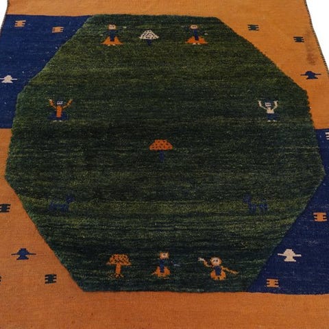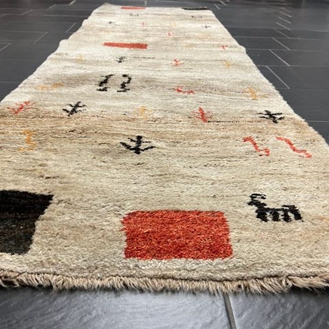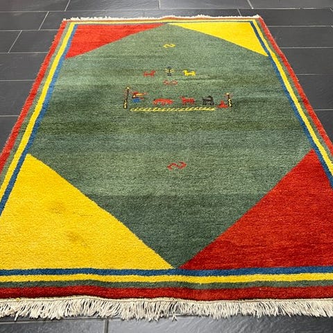 Gabbeh håndtuvet tæppe fra Indien, mål 225 x 170 cm, uld på uld, vægt 22 kg, i god stand. Klik på den blå "gå til varen" knap, for at købe eller byde på denne vare. Den samlede pris vil blive vist inden du afgiver dit bud.