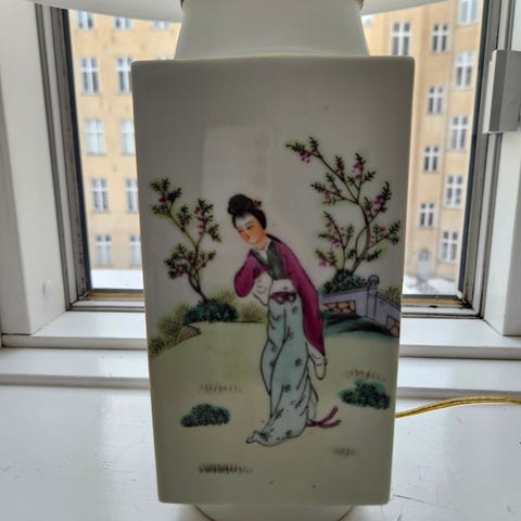 Bordlampe, træ og ben. Art deco, 1920'erne.brugs- og aldersslid. Mindre skader på skærm, reparation udført på lampen, kvinde stående på podiet, har fået nye fødder. 4 lampeskærmslameller i toppen er repareret. . Kunstneren til denne lampe har udeskåret 10 kvinder i forskellige erhverv på siden af ??lampeskærmen. De 4 små kvindefigurer har ingen umiddelbar forklaring på deres forskellige positurer, udover at de flankerer de 4 hjørner i forskellige positurer den høje figur h 6,5 cm 2,5 tommer de siddende figurer h 5 cm 1,9 tommer. At pris sætte denne håndskåret Ben Lampe er næsten umuligt, da der kun er den ene!