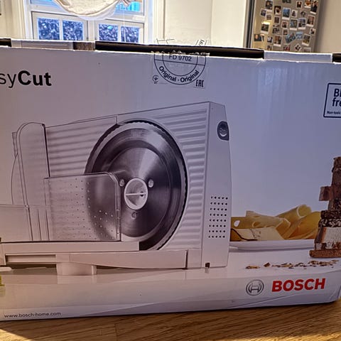 Bosch skæremaskine i sølvfarvet metal og plast. Maskinen har justerbart skærehjul til skiveskæring af fx brød, kød og ost. Betjeningsknap til indstilling af skivetykkelse sidder på siden. Enheden står på en stabil bundplade med integreret skærebakke. Velegnet til køkkenbrug, hvor der er behov for præcis og ensartet skæring af fødevarer.