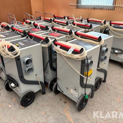 VEAB affugter på hjul i rød farve. Enheden er monteret på understel med to hjul og håndtag for nem transport. Fronten har gitter og ventilator, og der er betjeningspanel på siden. Egnet til affugtning af rum som fx byggepladser, kældre eller andre områder med behov for fugtregulering. Strømtilslutning via kraftstik, som fremgår af billederne.