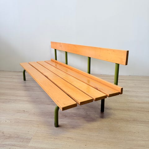 Bænken er betrukket med uldstof og har fine remme i ægte læder samt slanke sorte metalben. Der er enkelte kattekrads i stoffet og læderremmen på siden, men ikke ovenpå da bænken har været dækket af lammeskind.