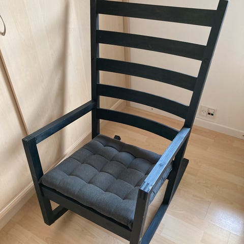 Gyngestol i træ med sæde i rød, ryg i gul og stel i grøn. Stolen har armlæn og let buede meder, som giver en gyngestols-lignende funktion. Egnet til børn og kan bruges som siddeplads i børneværelse eller legeområde. Designet til indendørs brug.