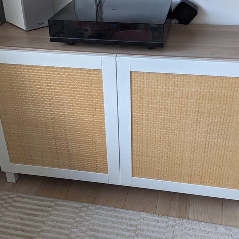 IKEA Bestå skænk med mål ca. 120 cm i bredde, 42 cm i dybde og 74 cm i højde. Skænken har korpus i egemønster med hvid bejdse og fronter i Selsviken højglans hvid. Indretningen består af lukkede opbevaringsrum med hylder, velegnet til opbevaring i stue, entré eller spisestue. Overfladen kan anvendes til fx tv, dekoration eller andre brugsgenstande.