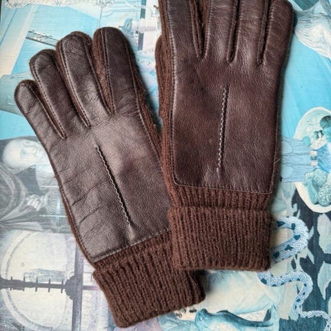 Et par brune handsker lavet af strikmateriale. De har en standard form med fem fingre og en ribkant nær håndleddet. Størrelsen på de enkelte handsker er 18 cm. De ser ud til at være komfortable og varme til brug i køligere vejr.