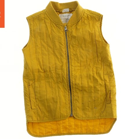 En quiltet vest i mørkeblå med gennemgående lynlås foran. Vesten har en høj krave og ingen ærmer. Der er små lommer i hver side, og et lille logomærke ved kanten nederst.
