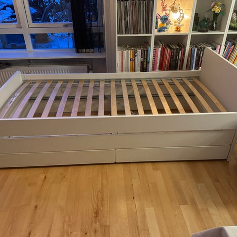IKEA SLÄKT seng med opbevaring i hvid. Sengen har flere skuffer, som giver god plads til opbevaring af fx legetøj, tøj eller sengetøj. Mindre skrammer på kant af seng/skuffe, derfor den billige pris (se billede 3)