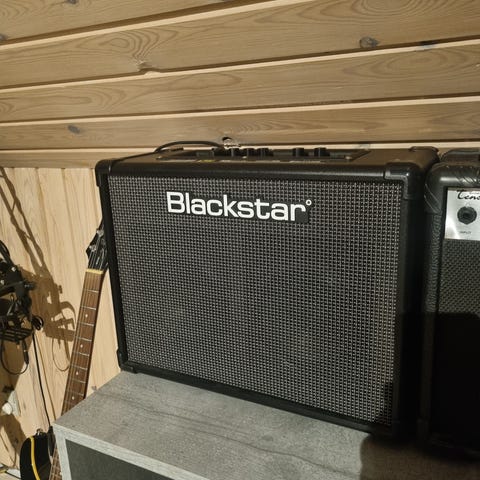 Line 6 SFX guitarforstærker og Teisco Checkmate guitarforstærker. Begge enheder er beregnet til elguitar og har integrerede betjeningsknapper på fronten til justering af lyd og effekter. Line 6 SFX-modellen er en mindre, sort combo-forstærker med indbyggede effekter. Teisco Checkmate-modellen er en større, lys combo-forstærker med flere kontrolmuligheder på frontpanelet. Velegnet til øvning, hjemmebrug eller mindre arrangementer, hvor der er behov for forstærkning af elguitar.