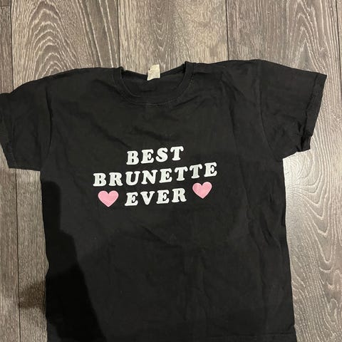 Navy t-shirt fra Fruit of the Loom med lilla tryk med disco kugler. Det står ikke str. i, men min datter har brugt den mens hun har været i str. 152. Den er Cropped/kort i modellen. Kommer fra røgfrit hjem.