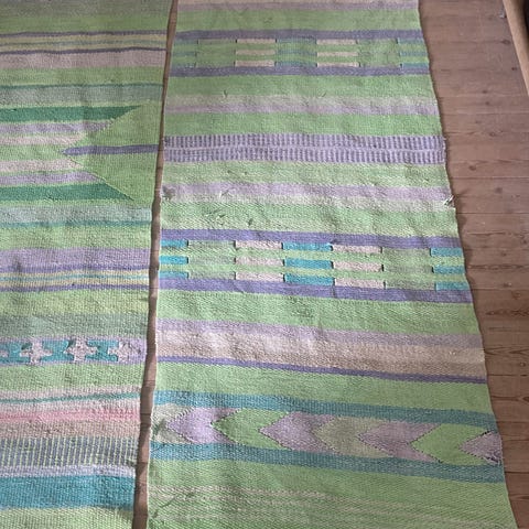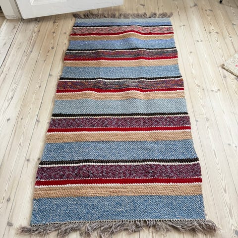 Smukt kludetæppe af bomuld, vævet af Birgitte Hiul i 1970’erne. Lyseblå og lysegrønner farver, ca. 70 x 260 cm. Kan vaskes i maskine på 40 grader. Nyvasket.
