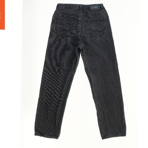 Et par jeans i lys blå denim med lynlås og knaplukning foran. Bukserne har to forlommer og to baglommer med et mærke på linningen bagpå.