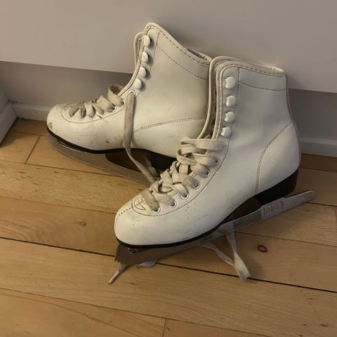 Kunstskøjter i størrelse 35. Klassiske hvide skøjter med snørelukning og sort hæl. Egnet til børn eller mindre fødder til brug på skøjtebane eller is. Blad i metal med tænder foran til bedre afsæt ved kunstskøjteløb.