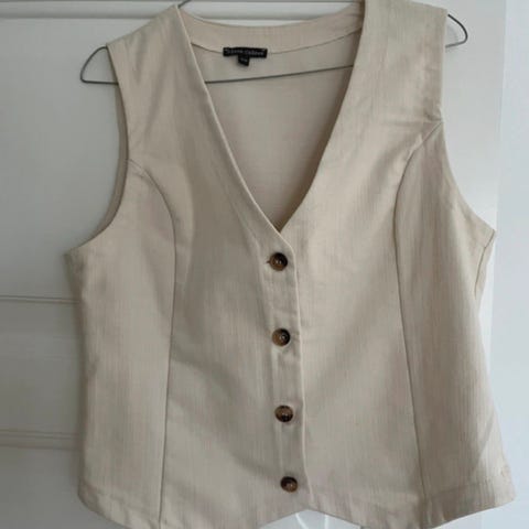 Super cool vest med de fineste detaljer sælges. Den har de fineste små ”puf” ærmer og finesser såsom længere fortil end bagtil. Bagtil går vesten ca. til buksekanten. Så cool til en tanktop eller chemise og med jeans til. Og ellers også til kjole. Nypris 1.500,- Foretrækker at handle via Mobile Pay. Prisen er ved selvafhentning, men ved forsendelse tillægges porto. Se evt. mine andre annoncer, giver gerne mængderabat