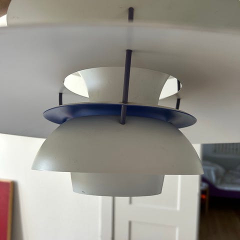 Lampen er brugt og bærer præg af alder med synlige brugsspor, ridser og let patina på skærmene (se billeder). Ingen buler eller større skader – den fungerer som den skal og giver stadig det karakteristiske, blændfrie PH-lys.