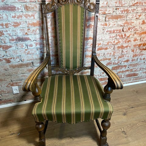 Lænestol med højt ryglæn, udskåret træstel og armlæn. Sæde og ryg er polstret og betrukket med bordeauxfarvet stof. Stolen står på kraftige, udskårne ben med tværstivere, hvilket giver et markant og dekorativt udtryk.