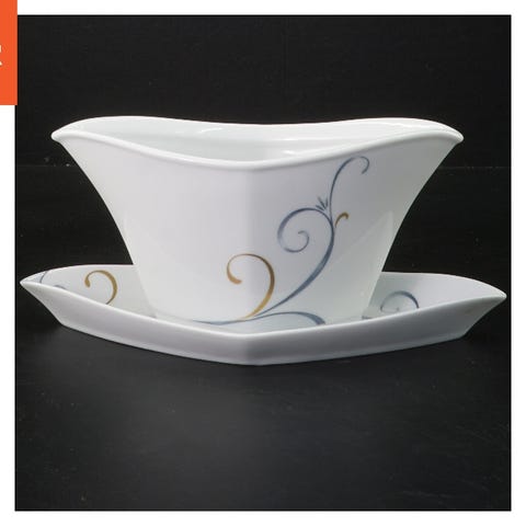 Fyrklöveren salt og pebersæt. Fyrklöveren Victoria kombinerer bølgende former, diskrete farver og smukke gulddetaljer. Det sarte, snoede mønster i blå, grå og guld er designet af Anne Rooslien som en hyldest til kærligheden. Lavet af porcelæn af højeste kvalitet - holdbart, tåler opvaskemaskine og perfekt til en luksuriøs borddækning, igen og igen! En fremragende bryllupsgave eller housewarming-gave.