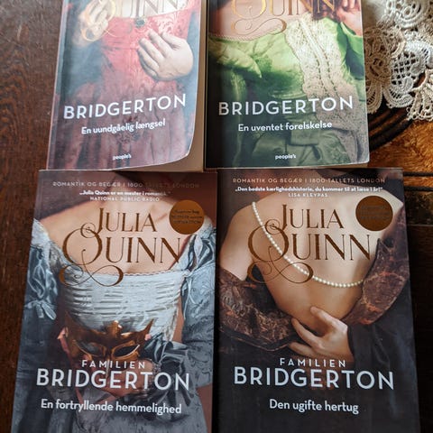 Jeg sælger hele Bridgerton bogserien (8 bind) af Julia Quinn i dansk paperbackudgave. Nogle er læst flere gange, mens andre næsten fremstår som nye. Sættet sælges kun samlet.