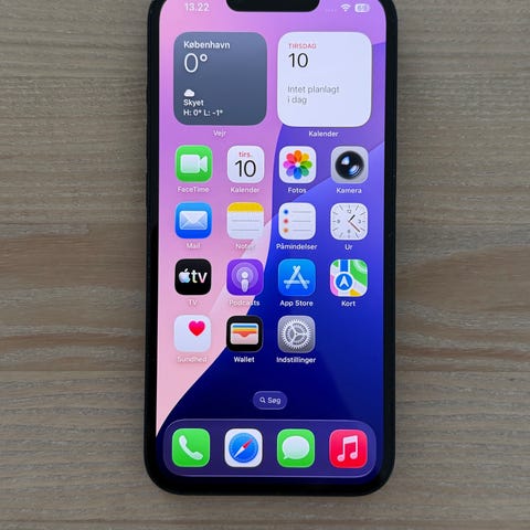 Apple iPhone 13 smartphone med 128 GB intern hukommelse. Modellen har dobbelt bagkamera, frontkamera i skærmens øverste kant og flade kanter.