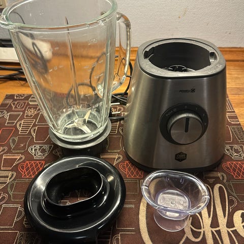 Denne blender har en base med en elektrisk ledning og en drejeknap med flere indstillinger. Den er udstyret med en klar glasbeholder med håndtag og tilhørende låg. Blenderen er lavet af sort plastik og glas og er designet til at blande ingredienser til smoothier, saucer eller supper.