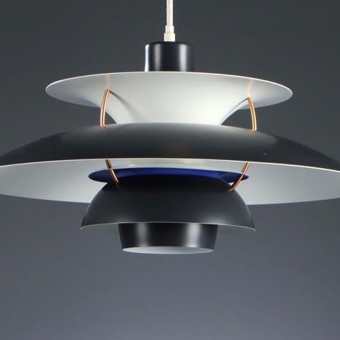 Louis Poulsen PH pendel designet af Poul Henningsen. Loftlampen har den karakteristiske flerskærmskonstruktion, der giver et blændfrit og nedadrettet lys. Lampen fremstår i en lavendelfarvet nuance med lyse indvendige skærme, som medvirker til en jævn lysfordeling over bord eller arbejdsflade. Velegnet som belysning over spisebord eller i køkken/alrum.