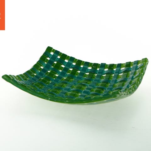 Dette er et unikt glasfad med en diameter på 11 cm. Fadet har en farverig sammensætning med nuancer af guld, blå og grøn samt enkelte dekorative elementer indlejret. Formen er asymmetrisk, hvilket giver det et kunstnerisk udtryk. Det kan bruges som dekoration eller til servering.