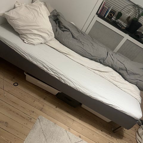 Sælger vores gæste seng - den har været brugt lidt. Der medfølger to topmadrasser.