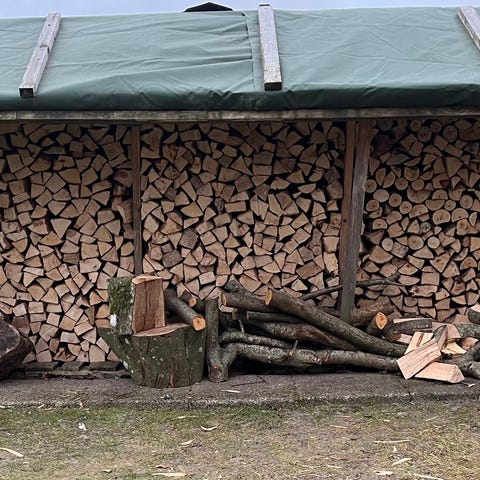 Bøgetræ fældet januar/februar 2025. Alt skåret 28 cm, anden længde kan aftales. Brændet er stablet i et metalbur/pallebur, som ses på billederne. Velegnet til fyring i brændeovn.