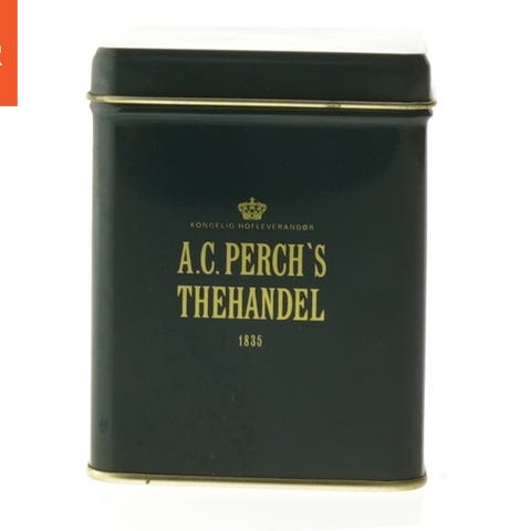 Dette er en te dåse fra A.C. Perch's Thehandel, grundlagt i 1835. Dåsen er rund med en diameter på 11 cm og en højde på 13 cm. Den er lavet af metal og har en dybgrøn farve med guldtekst, der viser mærkets navn og oprindelse. Dåsen har et aftageligt låg, som også er dekoreret med logoet i guld.