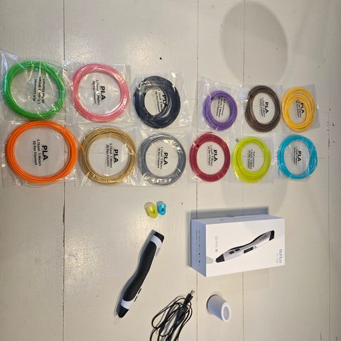 Sunlu SL-300 3D-pen. Sættet indeholder 3D-pennen, strømforsyning, brugervejledning, en mindre rulle filament samt en større spole filament. Pennen er beregnet til brug med 1,75 mm PLA- eller ABS-filament (jf. specifikationerne på æsken). Velegnet til tegning og modellering i 3D på forskellige overflader. Justerbare indstillinger for temperatur og fremføring af filament via knapper på pennen og display til visning af indstillinger.