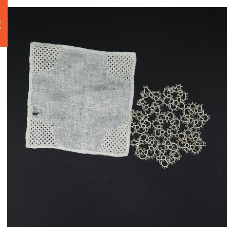 En hvid bordserviet med en detaljeret blondekant og broderet mønster. Servietten har en firkantet form med dimensioner på 45x45 cm, hvilket gør den velegnet som en dekorativ bordserviet til specielle lejligheder eller til daglig brug.