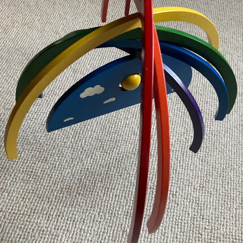 En dekorativ uro i form af en regnbue med skyer. Den er lavet af blødt stof og har afdæmpede farver som rødbrun, lyserød og hvid. Uroen har en trækugle og metalclips til ophængning. Dette sikrer, at uroen nemt kan hænges op i børneværelset eller andre steder som en hyggelig dekoration.
